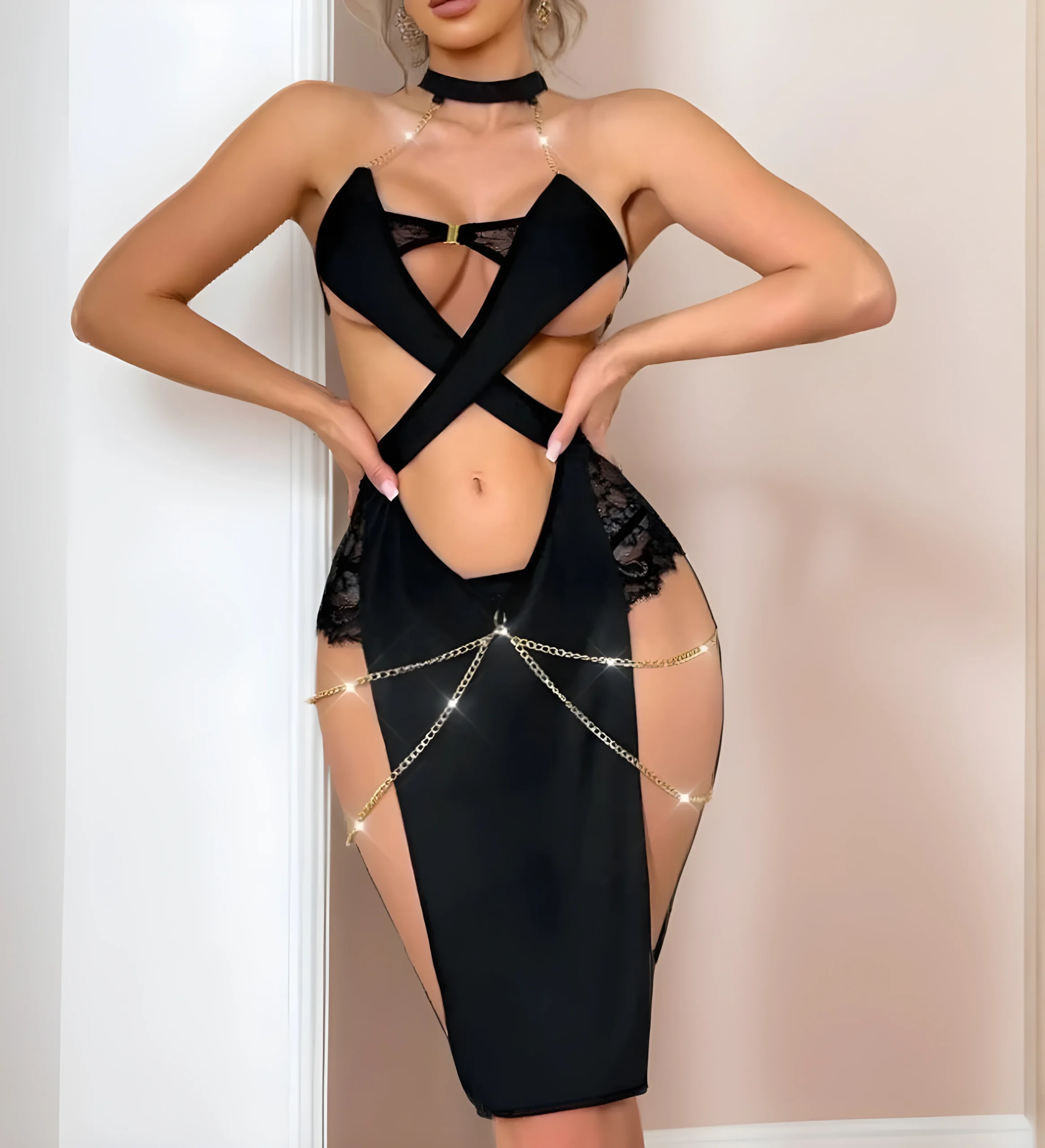 Der Look kombiniert orientalische Göttinnen-Vibes mit einem sexy Bohemian-Stil, und ist damit perfekt für alle, die sich gerne ausdrucksstark, feminin und außergewöhnlich zeigen. Die figurbetonte Passform und verspielten Details machen es zu einem absoluten Blickfang.