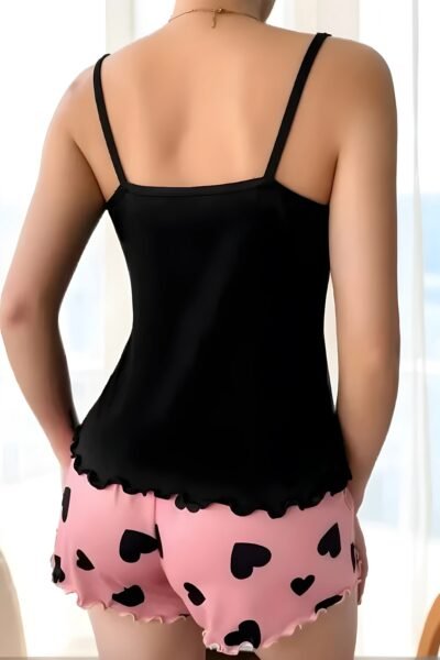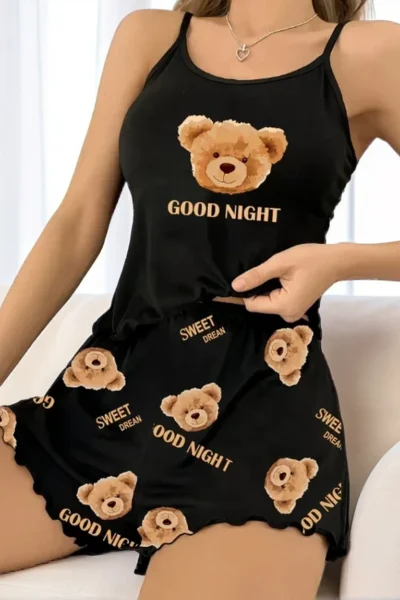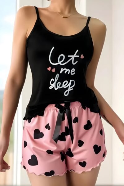 Dieses lässige Pyjama-Set für Damen ist der perfekte Mix aus Komfort und trendigem Design. Das Spaghetti-Träger-Top mit stylischem Letter-Print trifft auf eine locker sitzende Shorts – ideal für entspannte Abende, gemütliche Nächte oder einen stilvollen Lounge-Look zu Hause.