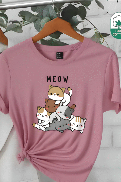 Verspieltes Damen T-Shirt mit Katzen-Stack & „MEOW“-Print – Süß, Bequem & Ideal für den Frühling & Sommer