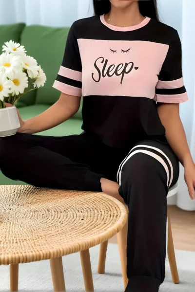 Add to WishlistSchon auf der WunschlisteAdd to WishlistDamen Pyjama-Set – Schwarz mit Rosa Farbblock & „Sleep“-Print. Bequemes Kurzarm-Schlafanzug-Set mit elastischer Hose für jede Jahreszeit