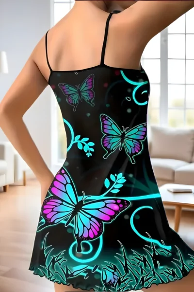Add to WishlistSchon auf der WunschlisteAdd to WishlistDamen Slip-Kleid mit Schmetterlingsaufdruck & Rüschenbesatz – Rückenfrei, Rundhalsausschnitt. Verspieltes Sommerkleid für Alltag & besondere Anlässe